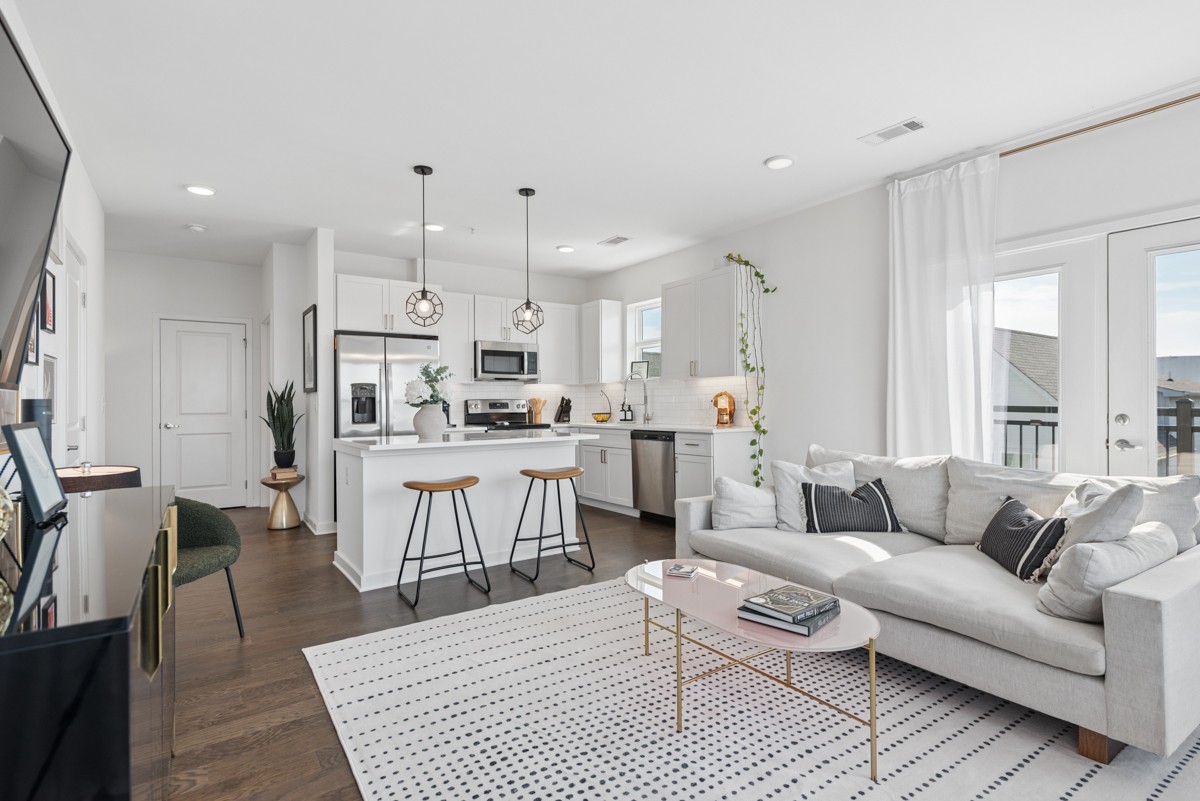Perched on the top-floor corner in the heart of The Nations, this light-filled 2-bedroom, 2-bath residence offers a front-row seat to some of the most stunning views in West Nashville. Inside, the open-concept layout is both inviting and functional, complemented by modern finishes and automatic s...