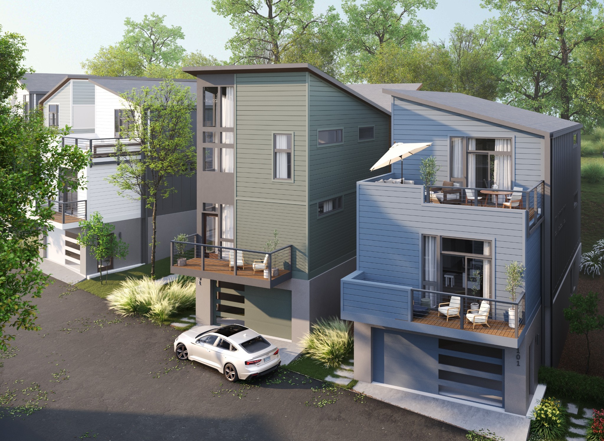 Everything looking the same? Dare to be different. HighView Cottages is a super convenient community of 3 and 4 bedroom homes featuring mid-century modern inspired architecture and a variety of floor plans. Strategically located in the Highland Heights neighborhood of East Nashville between the booming neighborhood retail corridors of Gallatin Pk & Dickerson Rd., HighView offers super quick access to town via Ellington Parkway. Perched on a hillside loop road offering wonderful views of the skyline, this tranquil community is tucked away off a quiet side street just south of Trinity Lane and features a walking trail in and around an old growth tree save courtyard, outdoor gathering spaces as well as a dog park.